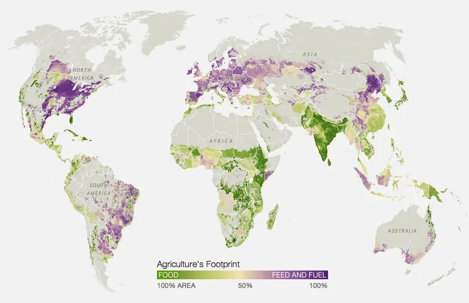 But there is another side. National Geographic did a nice spread on the challenges of feeding 9 billion people in the future. One of their nice graphics illustrated the degree to which land was being used to support human food vs animal and fuel-based foods. They show that most of the agriculture in the US and Europe supports animals and fuels while in Africa and India most of the agricultural land is used for people. An FAO article from the UN states that “…26% of the Planet’s ice-free land is used for livestock grazing and 33% of croplands are used for livestock feed production. Globally, livestock provides 25 percent of protein intake and 15 percent of dietary energy.” So, over half of the usable land gives us only a quarter of our protein.